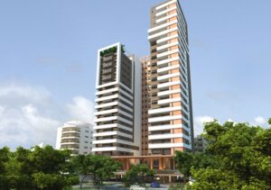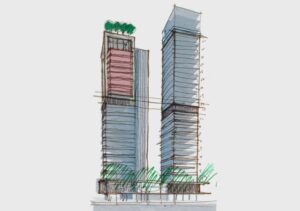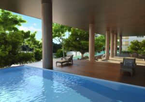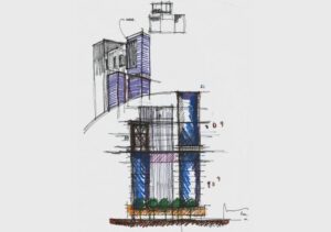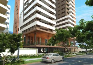 En este proyecto el planteamiento de tres torres independientes es intencional y responde al propósito de maximizar en cada apartamento el disfrute de las vistas, la ventilación y la entrada de luz. La secuencia y horizontalidad de las terrazas frontales llevan la vista tanto hacia el techo jardín y el antepecho de quiebrasoles verticales como al basamento del proyecto en la medida en que el visitante se aproxima al proyecto.